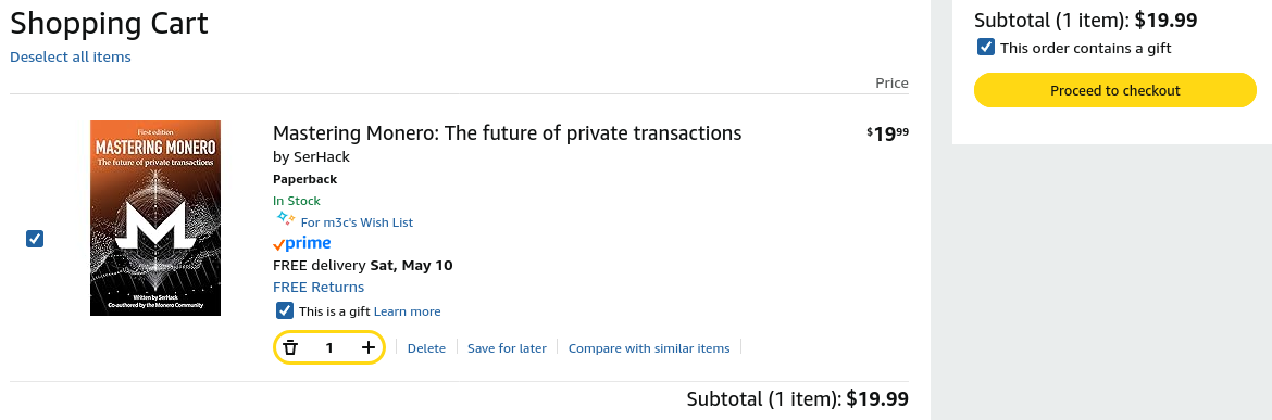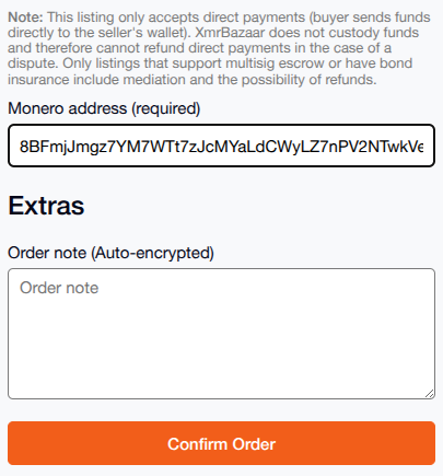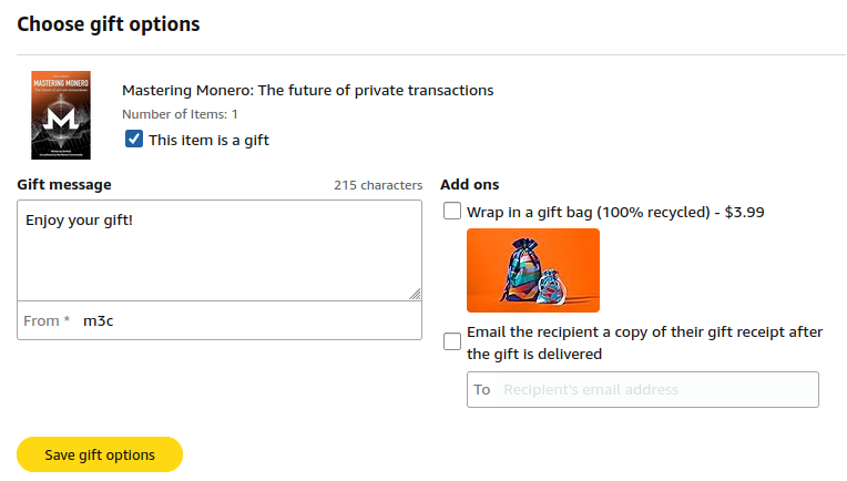 Also verify the gift options during checkout. You may want to delete your real name and enter your XMR Bazaar username.