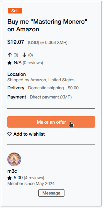Below are steps to find listings on XMR Bazaar and purchase product via Amazon with fiat to receive non-KYC Monero. You only need to purchase the item and supply tracking information. Once the item is delivered, you'll receive the agreed amount of Monero.
